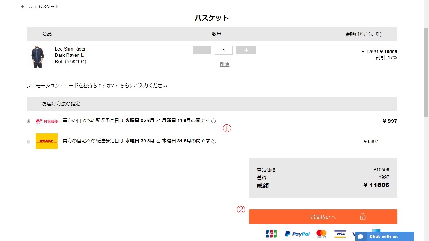 まだ買い物を続ける場合は特に何もクリックせず、他の商品を探して問題ありません。終了する場合は①の「バスケットを見る」をクリックして下さい。