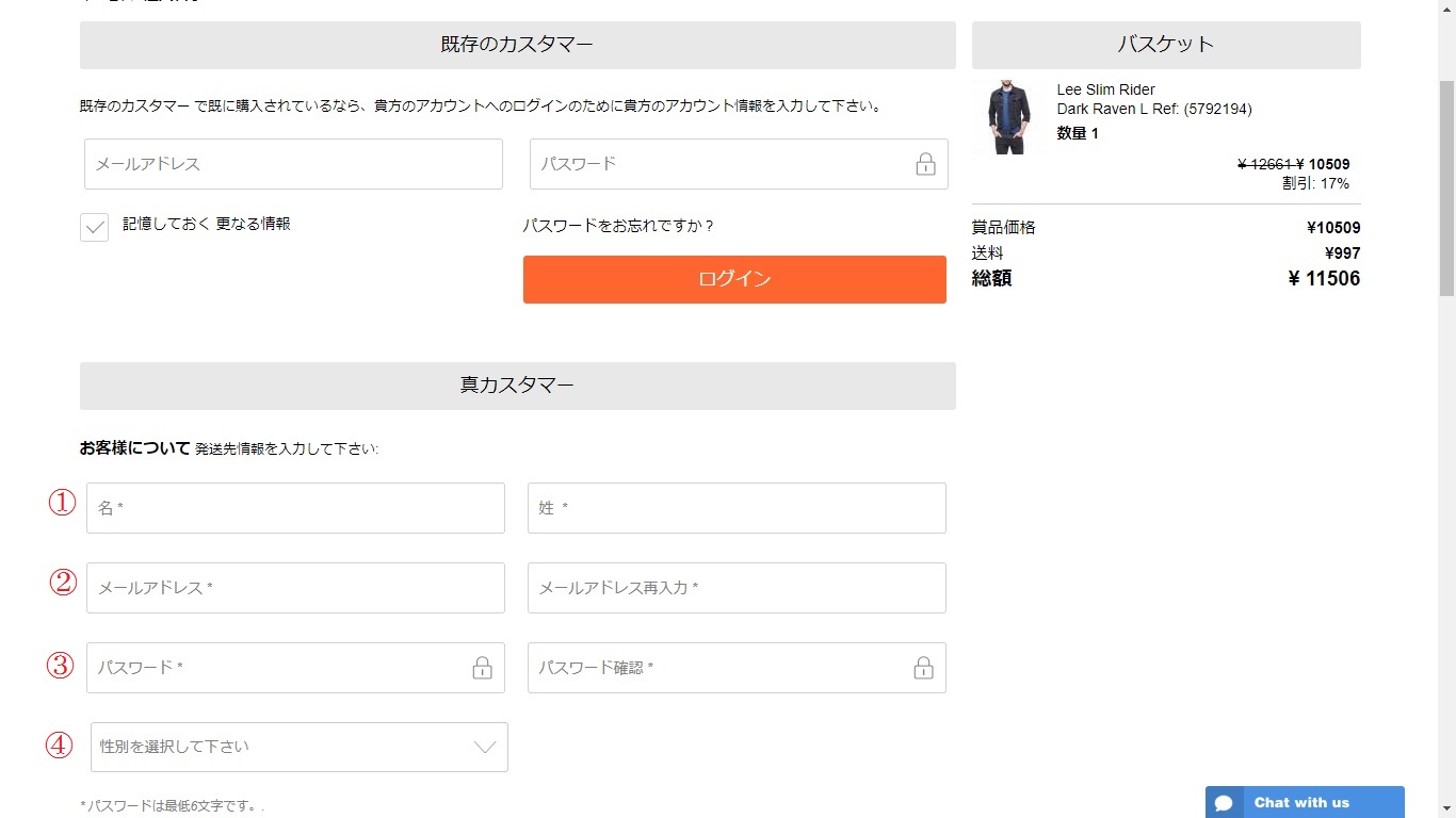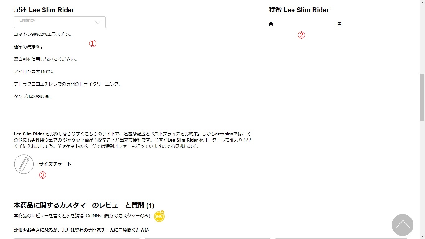 ②でサイズチャートを見ることができます。衣料品を購入する上で一番重要なサイジング確認なので、必ず目を通すようにして下さい。