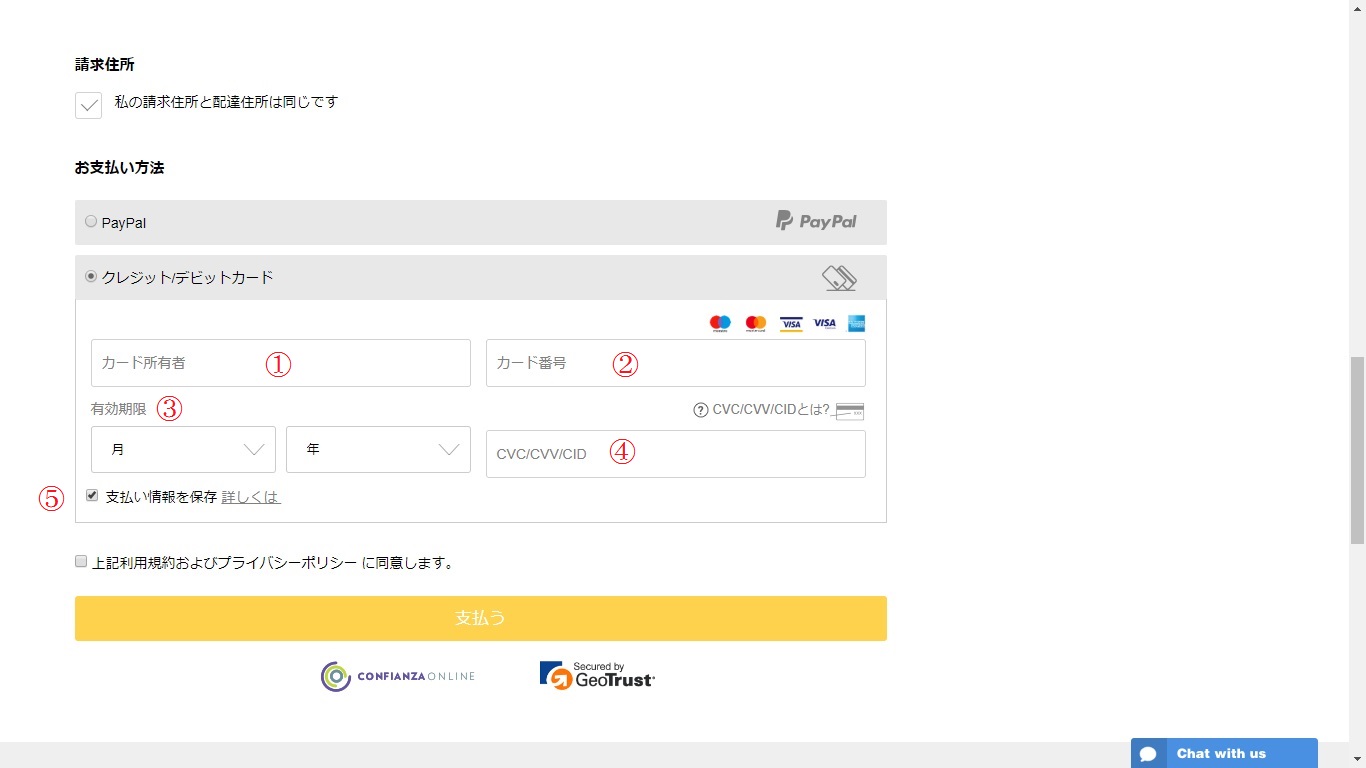 ③有効期限:クレジットカードに指定された「月」と「年」を入力。