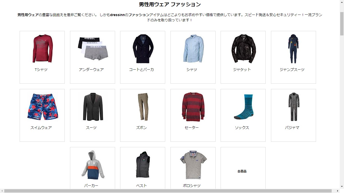 ここでは「男性用ウェア」をクリックし、商品を見つけ出します。すると、以下のような画面が表示されます。