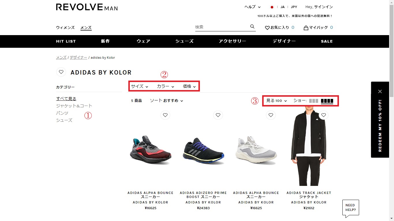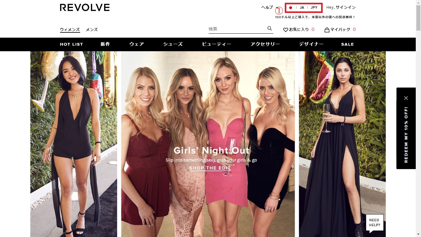 サイトは日本語になっていると思いますが、万が一そうでなかった場合、商品を探す前に①の部分をクリックして下さい。