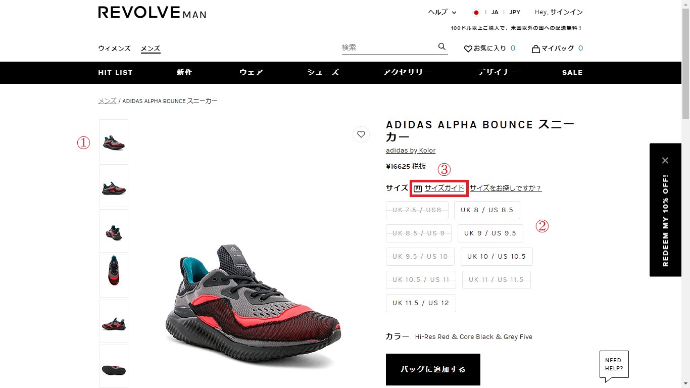 ①が画像変更、②が在庫の有無、③の赤枠がサイズガイドとなっています。商品を購入する上で一番重要なサイジング確認なので、必ず目を通すようにして下さい。