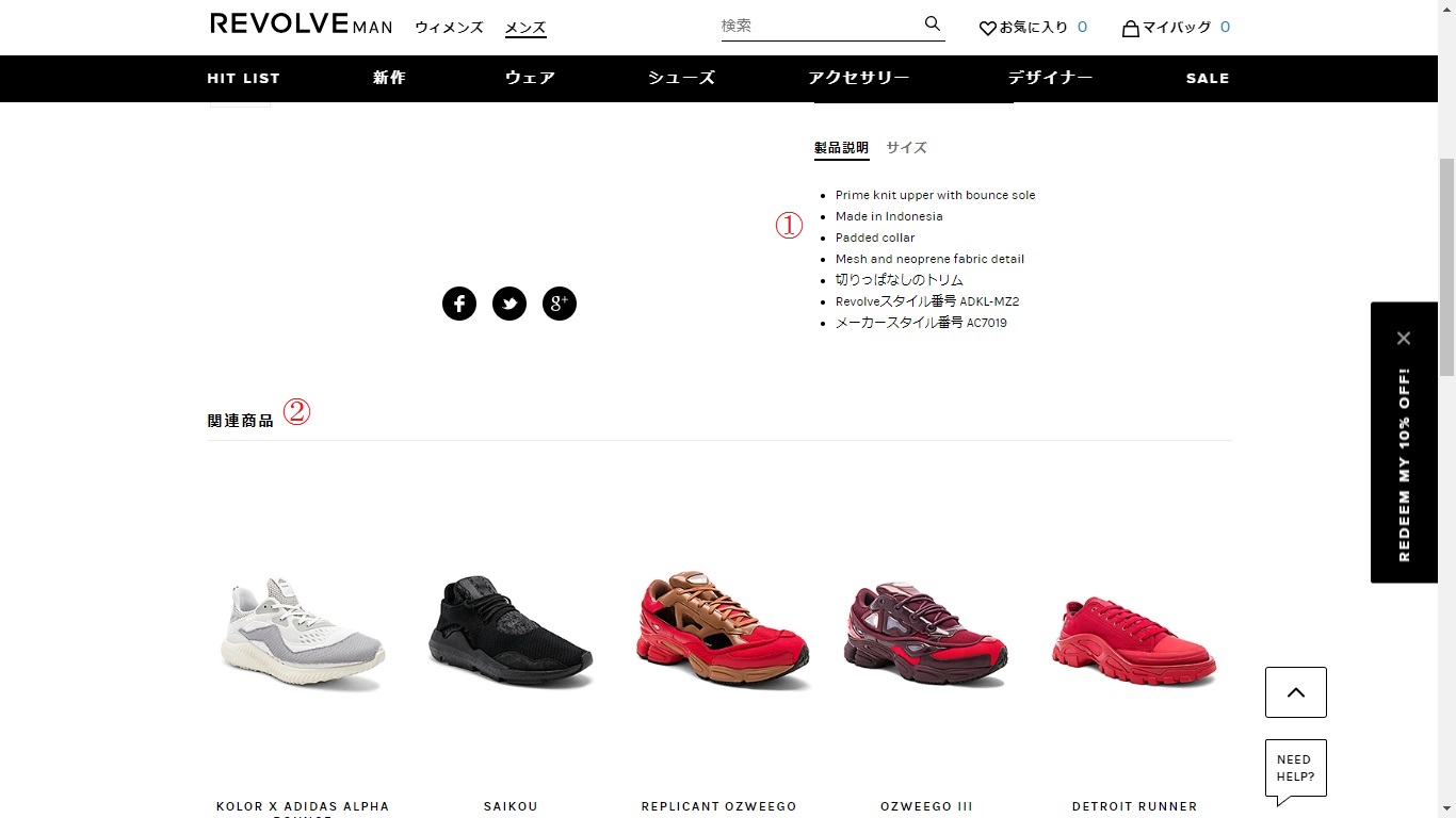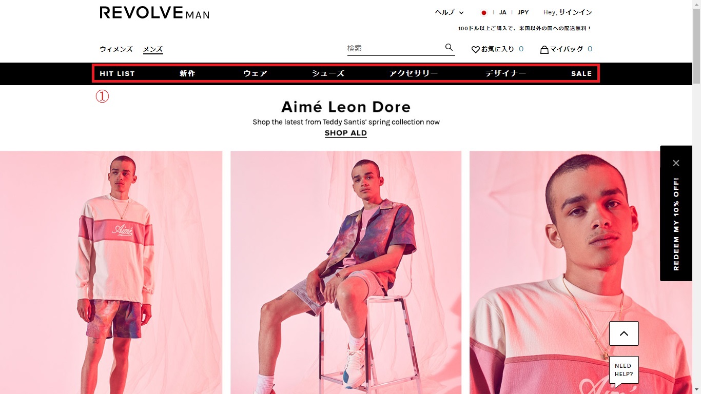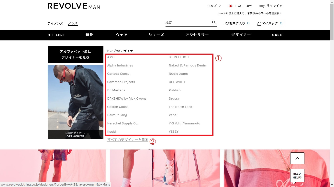 赤枠の①は、レボルブの人気ブランドをTOP20にて紹介しています。