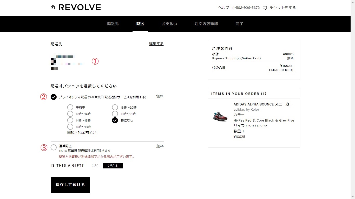 ②は、プライオリティ配送になり、通常よりも早くて時間帯指定が行えます。現在は無料ですが、後ほど追加送料が発生する場合があります。また、関税と税金は前払いとなっていますのでご注意を。