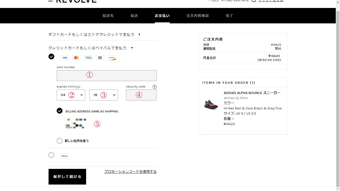 支払い方法は、「PAYPAL」「クレジットカード」「ギフトカード」「ストアクレジット」がありますが、ここではクレジット支払いの方法について説明します。