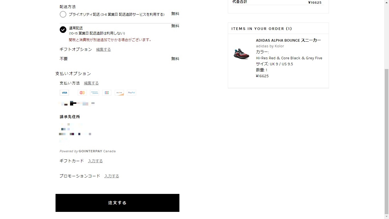 最終確認として、住所、配送方法、支払い方法の確認となります。
