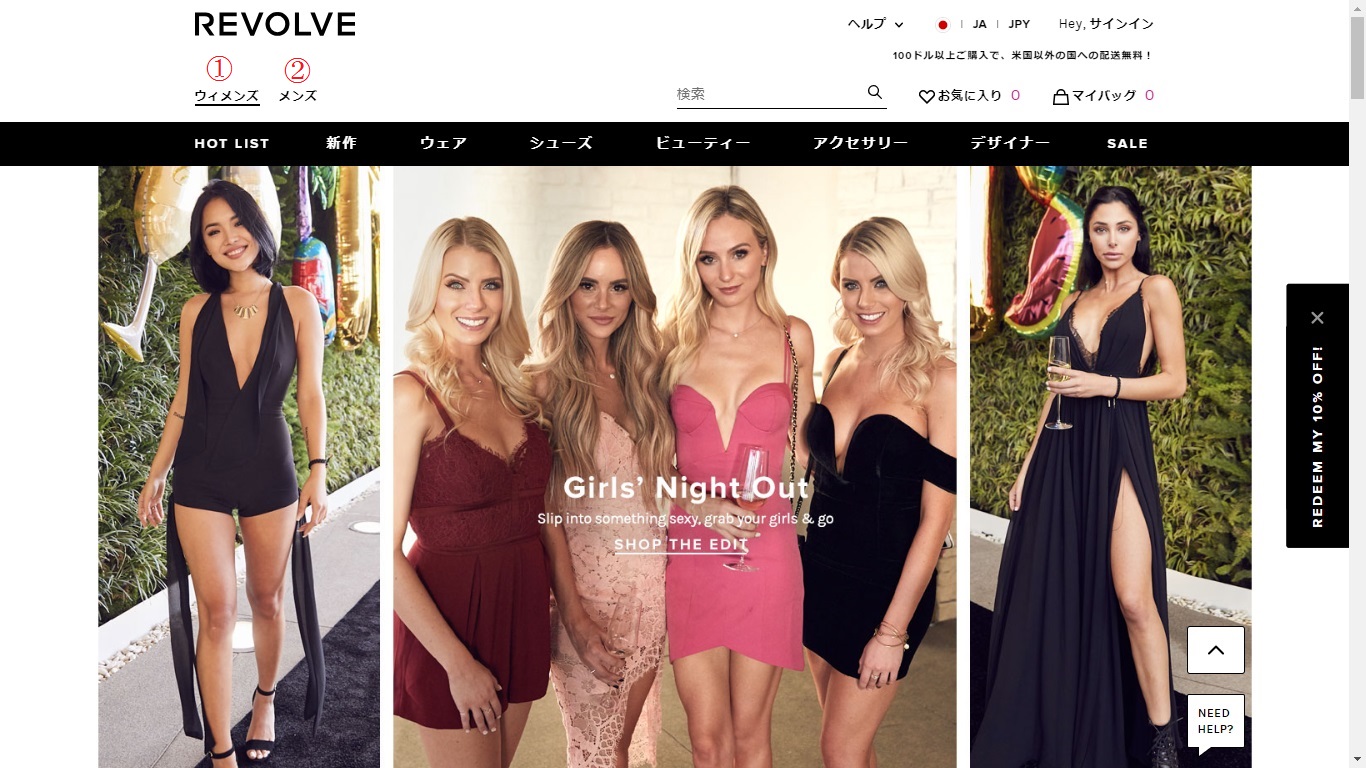 ①がウィメンズ、②がメンズのサイトとなっており、クリックすると各性別の専用サイトに移動します。