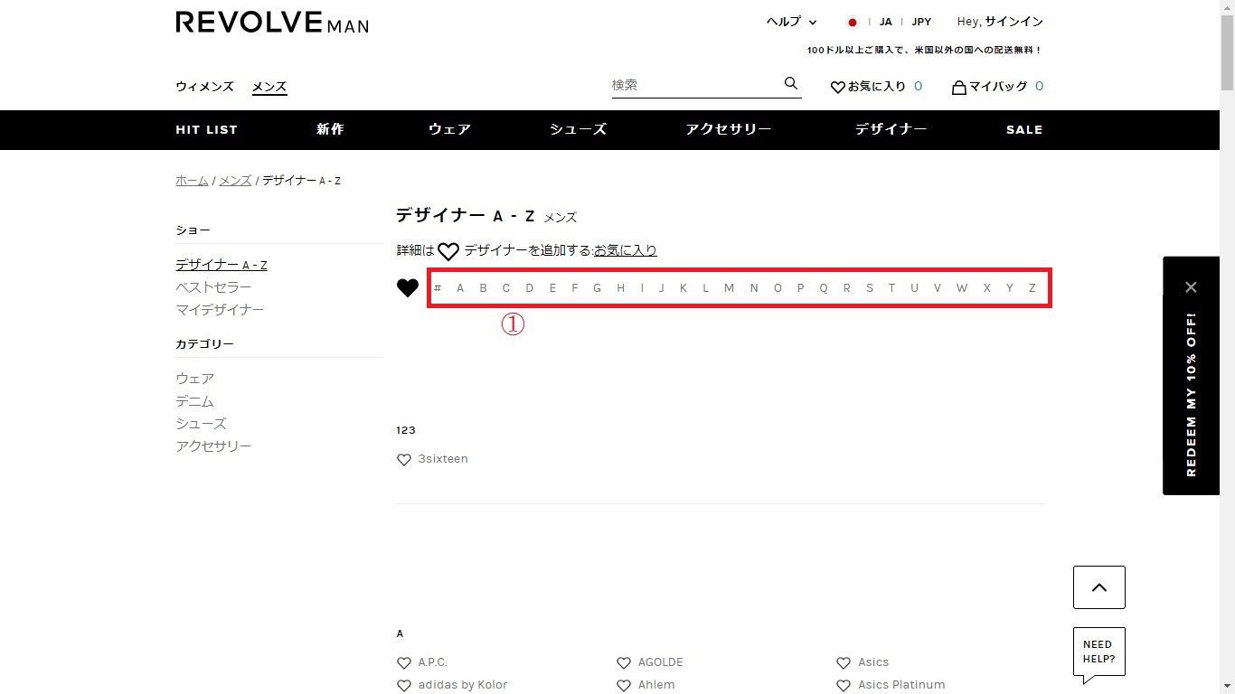 AからZのアルファベット順になっていますので、下にスクロールしていけばブランドを探し出すことができます。