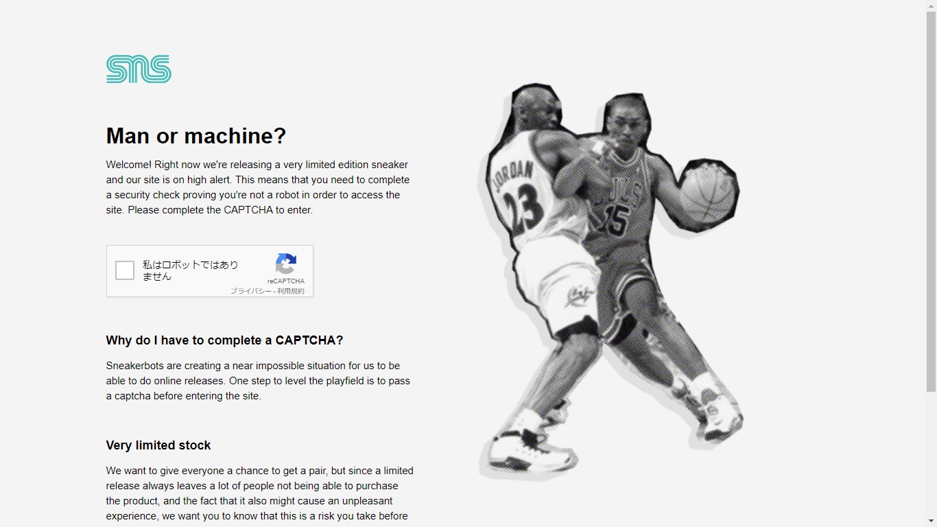 Sneakersnstuffの初回訪問時は最近ウェブサイトで見かけることが多い「私はロボットではありません」の項目欄が表示されます。