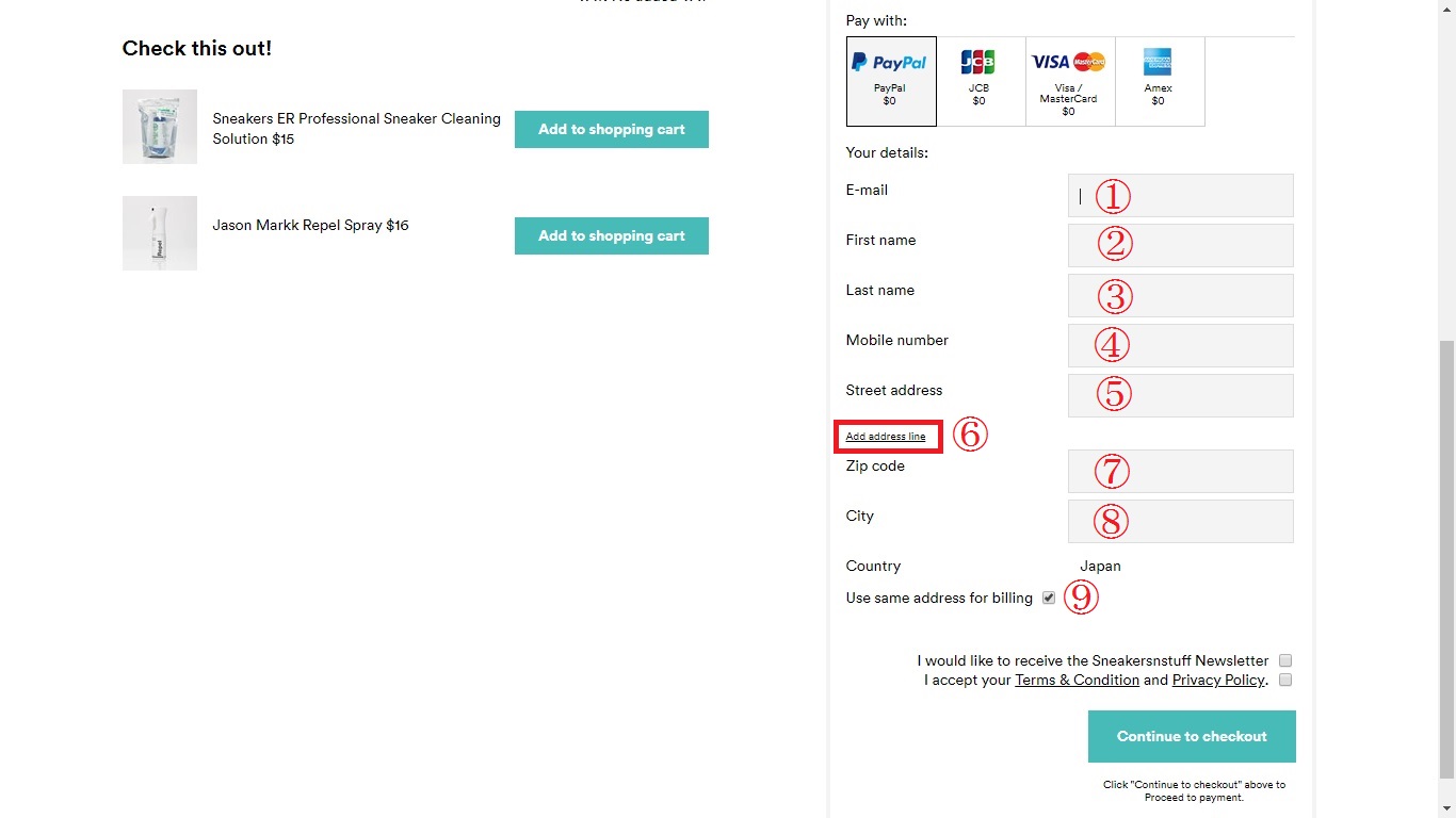 ⑨「Use same address for billing」のチェック欄は、請求先と商品の配送先が同じ場合にチェック項目を入れて下さい。そうでない場合はチェックを外して下さい。そうすると、別の請求先ということで、再度入力画面が表示されます。