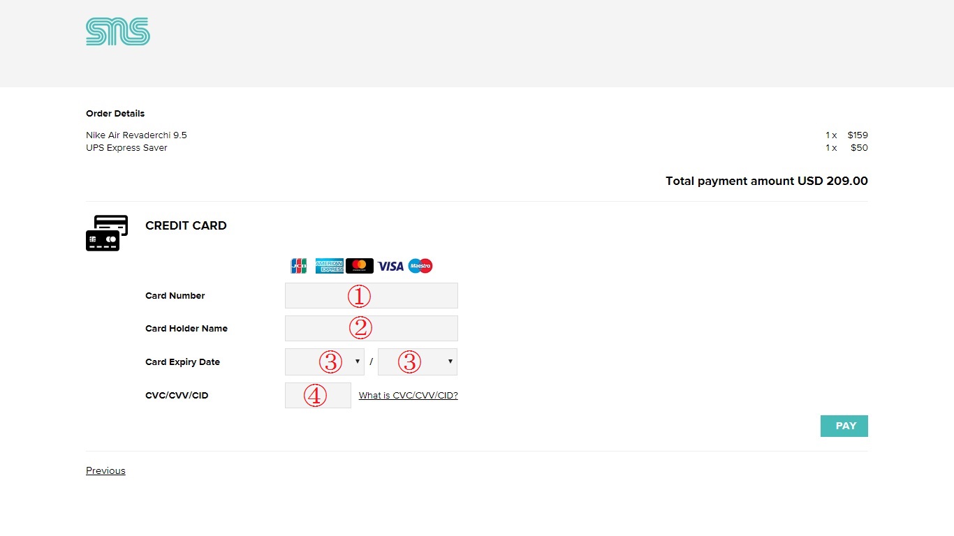 ④CVC/CVV/CID:裏面に記載されている3ケタのセキュリティー番号(アメリカンエキスプレスは表面の4ケタの番号)。