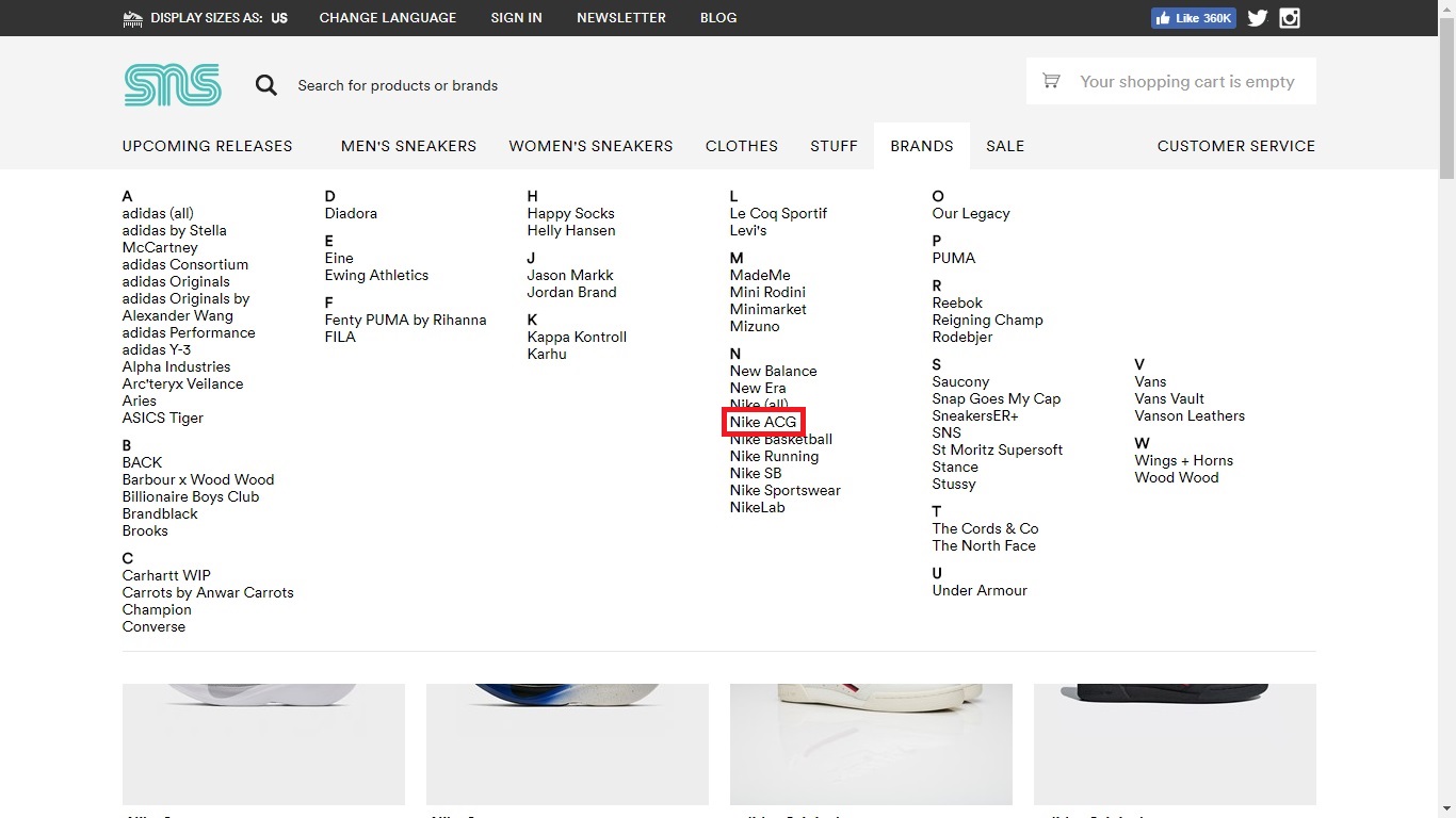 丁度Nのアルファベットに、2018年に復刻を果たした「Nike ACG(ナイキ オール・コンディション・ギア)」の項目がありましたので、そこをクリックして下さい。