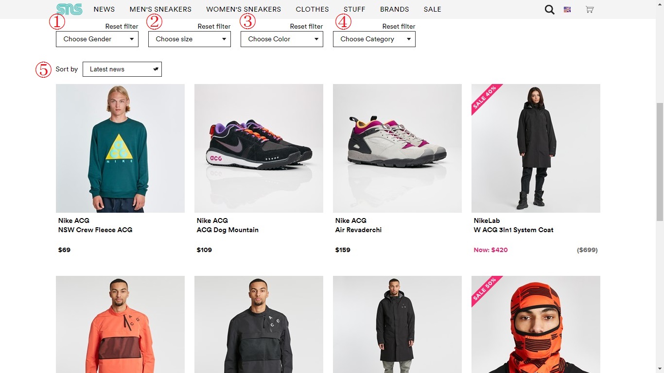 ④の「Chooze Category」は、スニーカー、衣料品、アクセサリーの商品別での絞り込みができます。
