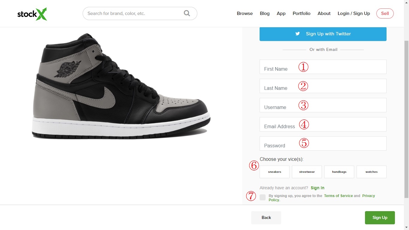 StockXのアカウント登録画面が表示されたら各項目ごとに入力を行います。
