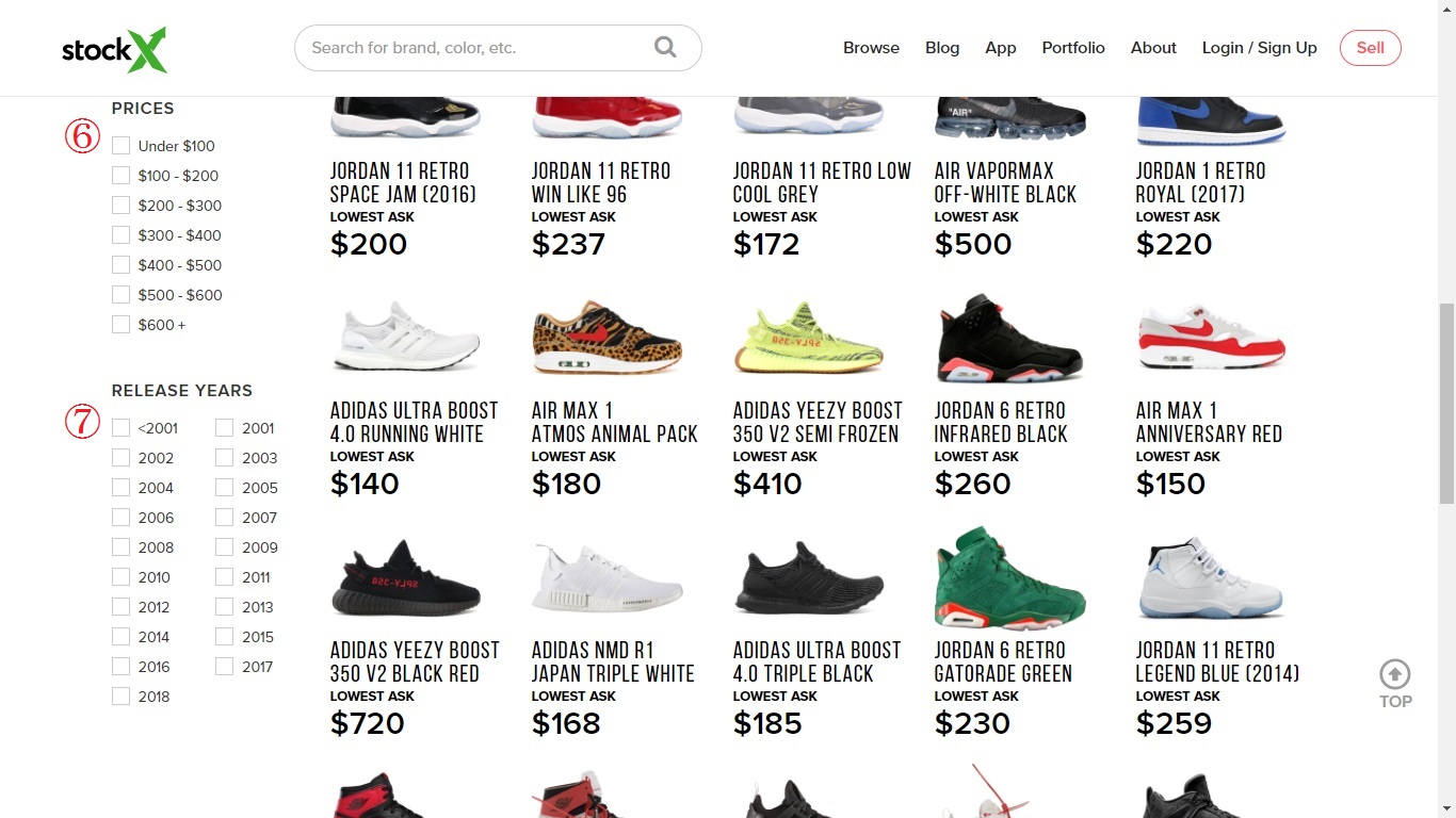 ⑤はサイズの絞り込みです。3.5(21.5cm)から18(36cm)まで幅広く絞り込みができるのが特徴的です。
