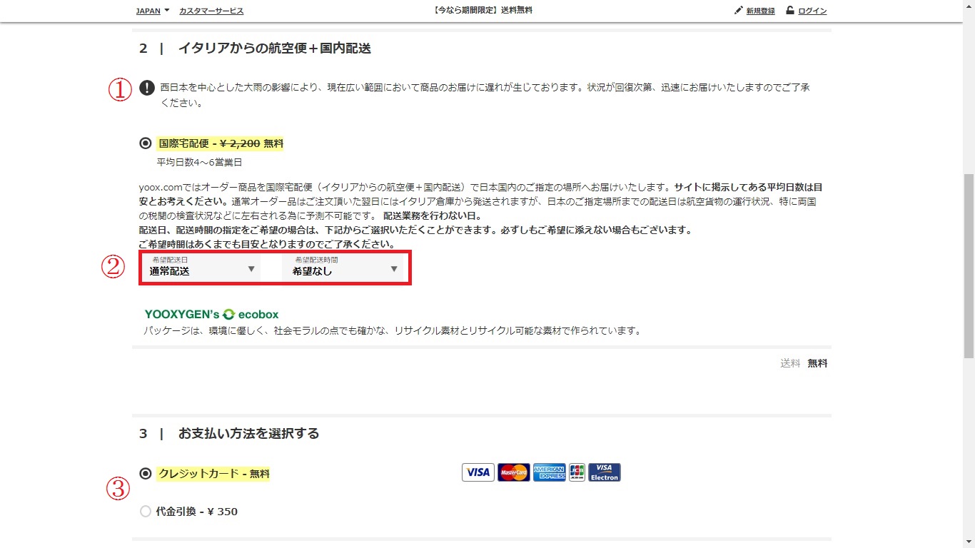 ②の赤枠は、配送希望日と時間帯です。海外通販サイトでは日時指定が無い場合があるので、非常にありがたい項目です。