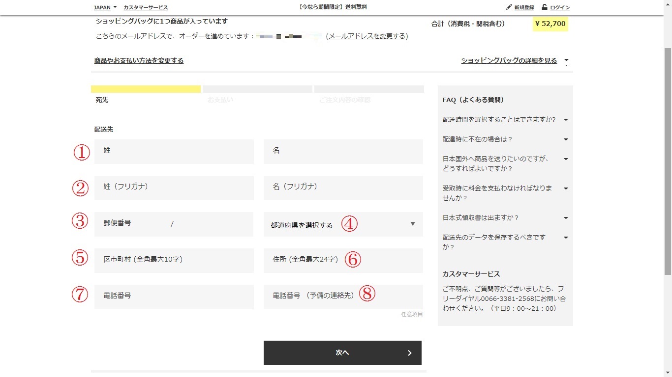 配送先住所入力画面に移動します。必要項目は漏れなく入力して下さい。