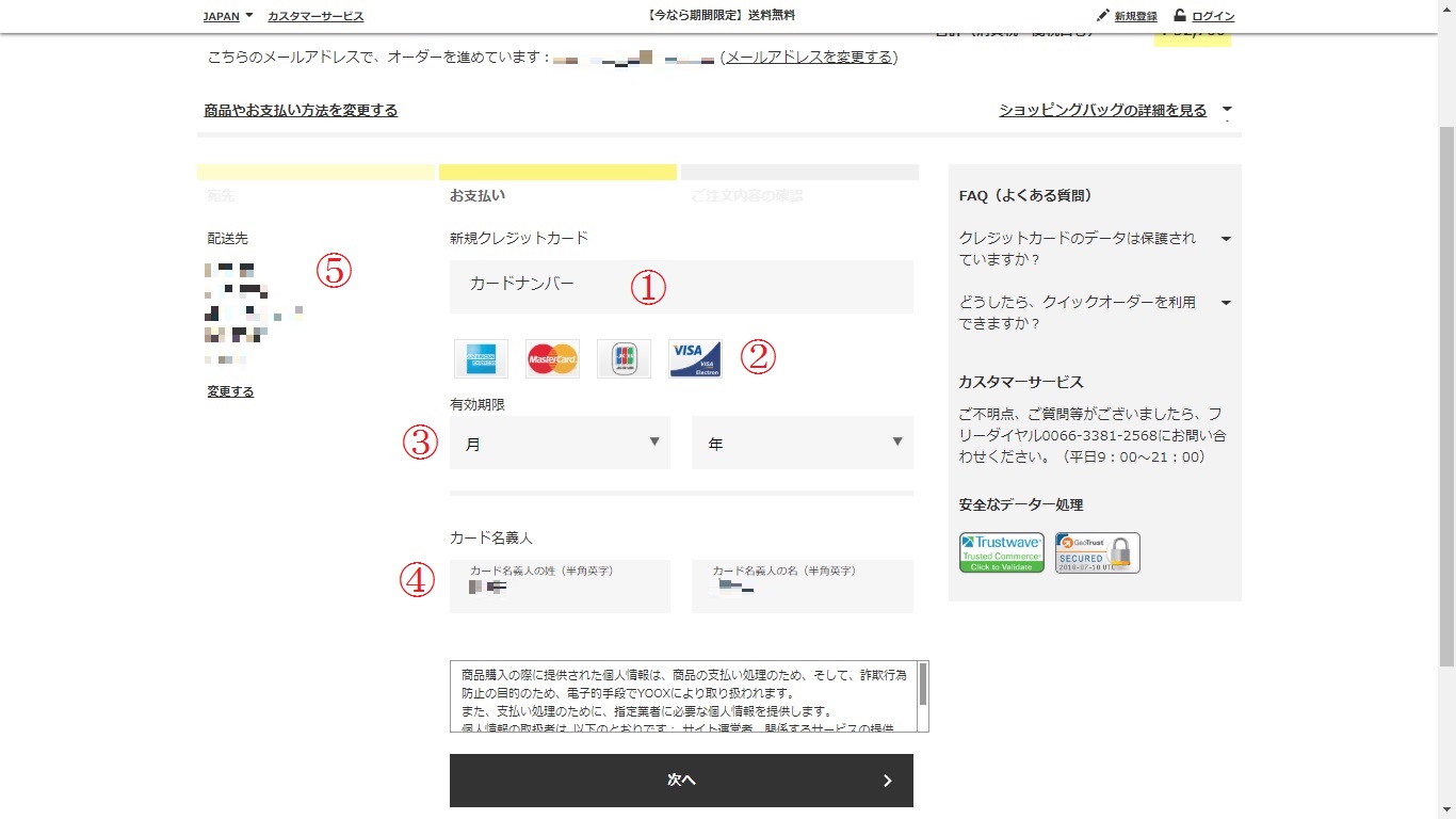 こちらでクレジットカードの登録が完了ですが、⑤に先程入力した配送先住所が記載されていますので、間違いが無いか確認するようにしましょう。問題無ければ、「次へ」をクリックして下さい。