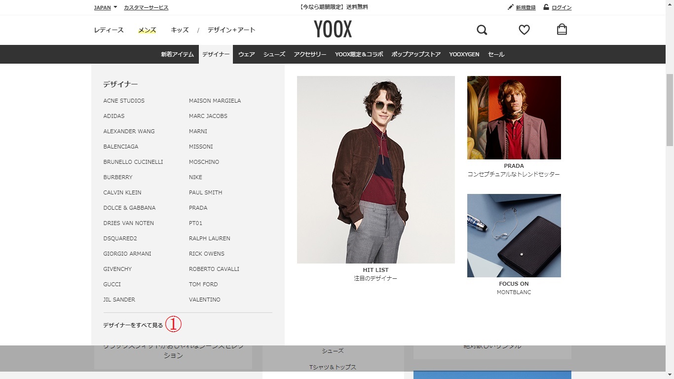 先程も解説致しましたが、ヨークスで人気のブランドが表示されます。次に、①の「デザイナーを全て見る」をクリックします。