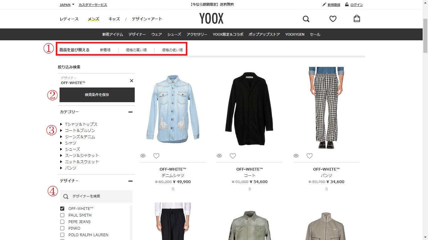 ②の「検索条件を保存」は、登録したブランドが新規入荷した際にEメールにて送られてきます。気になるブランドがあれば、クリックすると良いでしょう。なお、こちらはログインしている状態のみにブランド登録できる為、ログインした際に行うようにして下さい。