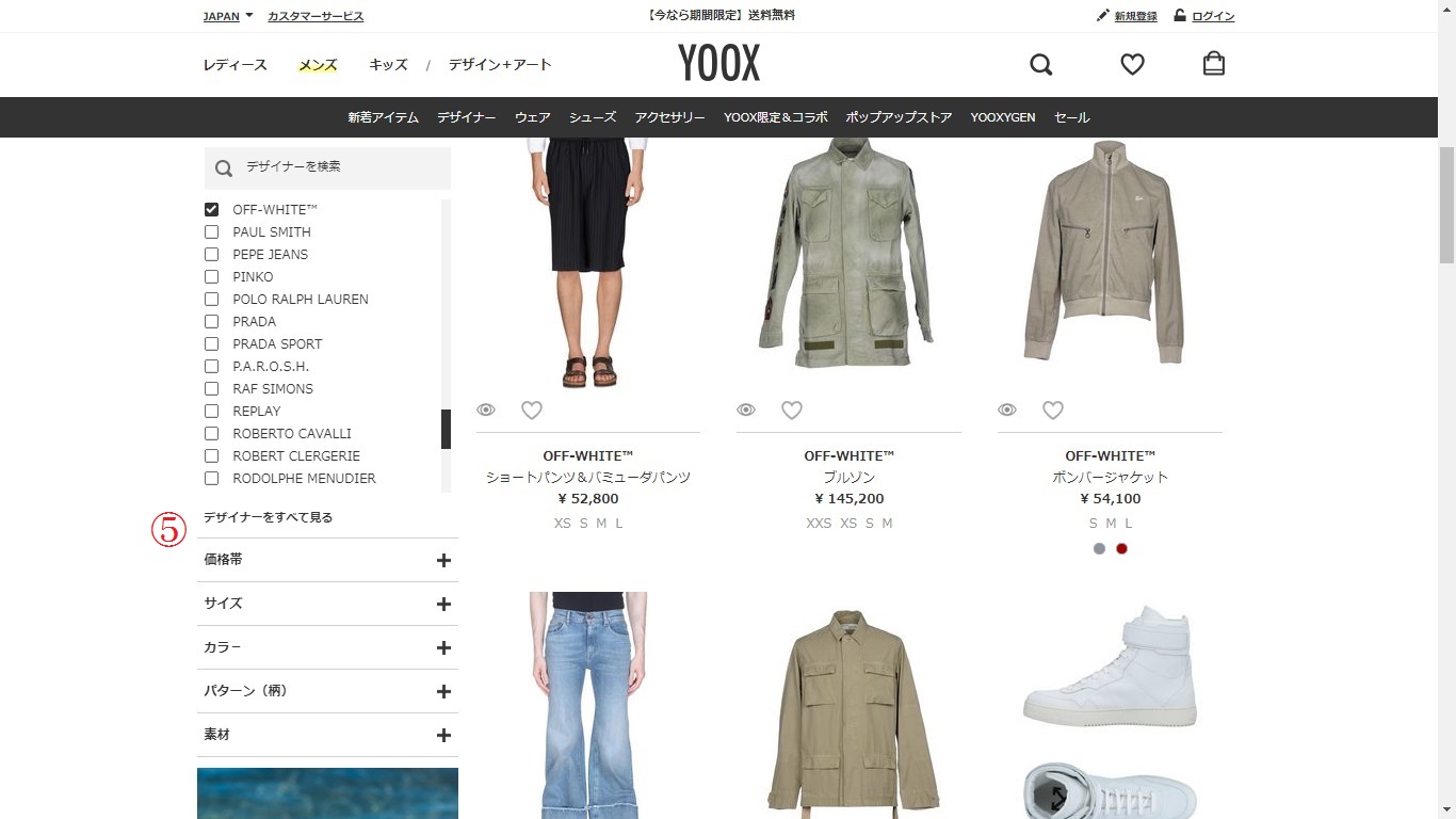 ⑤は、価格帯、サイズ、カラー、パターン、素材による絞り込みです。該当項目をクリックすると、絞り込み条件が出てきます。