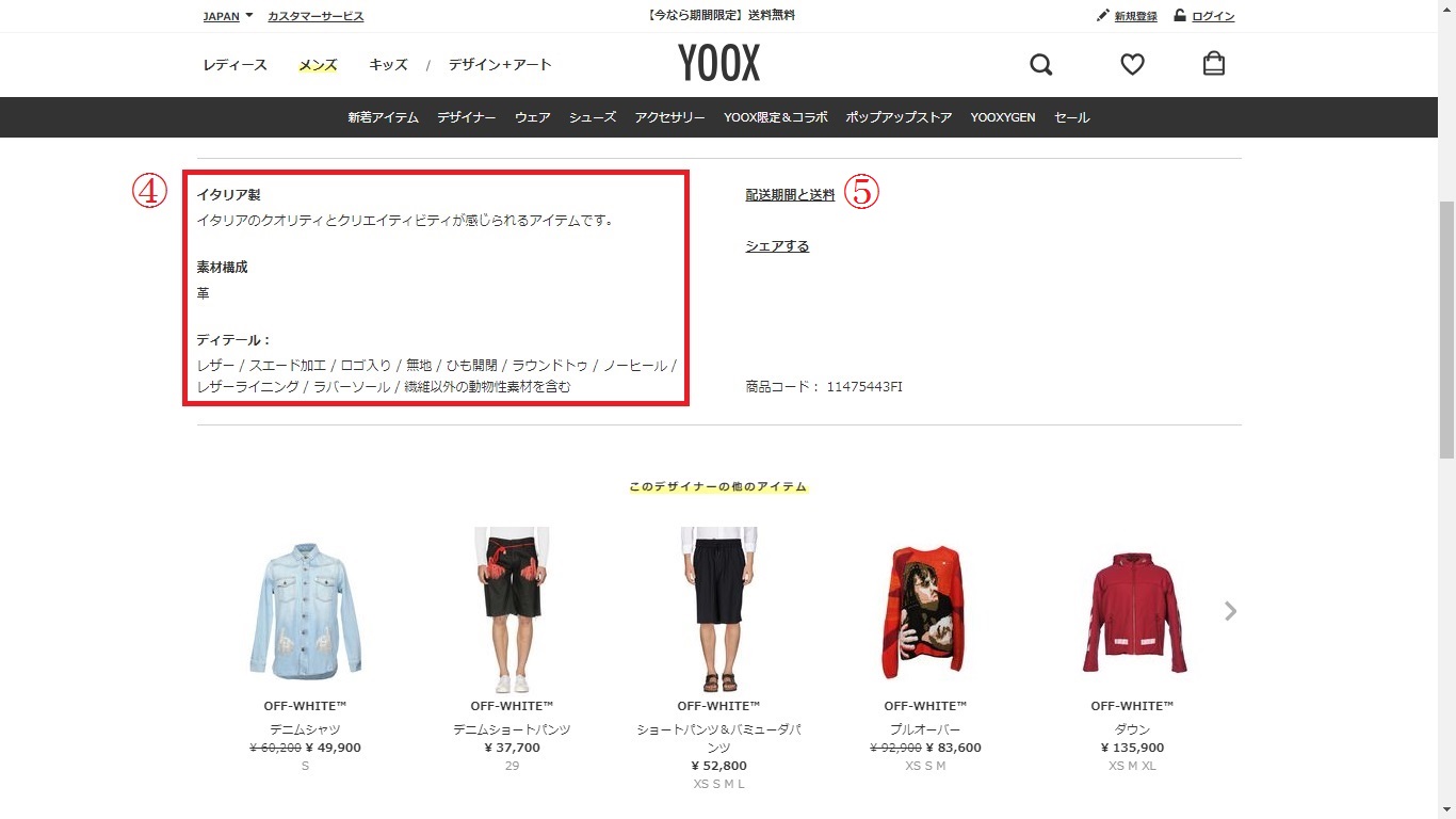 ④の赤枠は、ディティールから素材に関しての簡単な商品説明です。